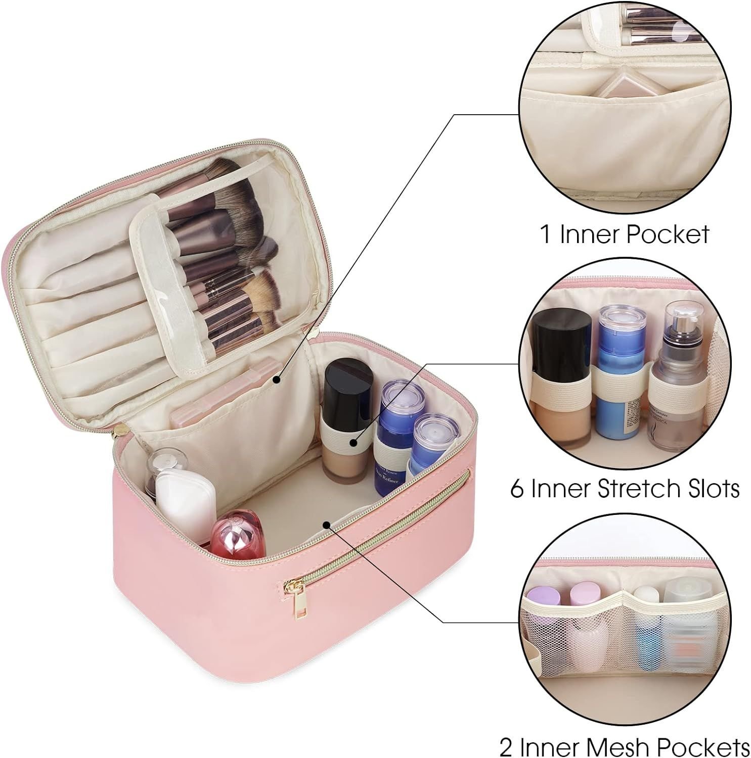 Makeup Bag, Travel Make Up Organizer Cosmetic Brush Bags Case for Women in Vegan Leather, Pink, Patent Pending