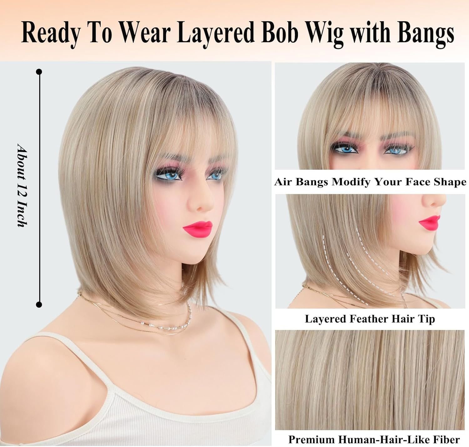 Layered Bob Wig with Fringe, Short Straight Wig with Undetectable Matte Fibres for Thinning Hair Daily Wear, Chemo Safe Lightweight Synthetic Mommy Wigs for Mature Women Ombre Light Blonde