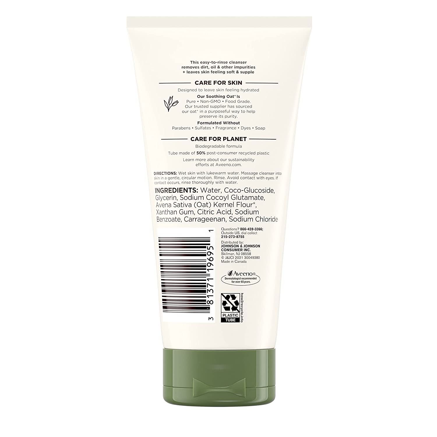 Cleanse skin with Aveeno Daily Moisturizing Facial Cleanser with oat. This face wash from a dermatologist-recommended skincare brand gently removes dirt, oil, and impurities while hydrating skin to leave it soft and supple. Formulated with pure, non-GMO, food-grade oat that has been sourced in a purposeful way to help preserve its purity, the moisturizing face wash has a biodegradable formula that rinses easily for a clean feel. The hydrating cleanser is fragrance-free, paraben-free, sulfate-free, soap-free, and dye-free. For best results, wet skin with warm water and apply the soothing oat cleanser in a gentle, circular motion. Rinse and follow with Aveeno Daily Moisturizing Face Cream.